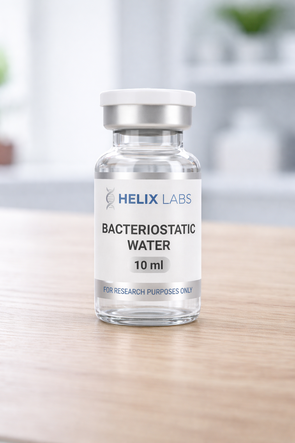 Sterile Bacteriostatic Water in a 10ml vial, ideal for peptide reconstitution and medical use. The vial features a clear, sterile liquid with a secure rubber stopper and aluminum seal. Designed for safe and effective mixing of peptides, ensuring purity and stability. Perfect for laboratory and personal use, this small volume is convenient and easy to handle.